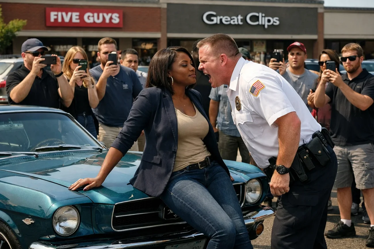 The command echoed across the shopping center parking lot, sharp enough to turn heads. Officer Derek Mitchell stood rigid beside a flawless blue 1967 Mustang, one hand resting near his holster. His eyes never left the woman standing by the driver’s door.