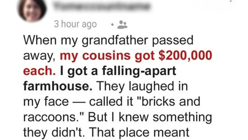 Upon the passing of my grandfather, my cousins were each allocated a substantial sum of two hundred thousand dollars in liquid funds. For my inheritance, I became the recipient of a dilapidated, crumbling farmhouse. Their open derision followed swiftly; they assigned it the cruel nickname, “bricks and raccoons.” I harbored a hidden knowledge, a piece of the story of which they were completely unaware.