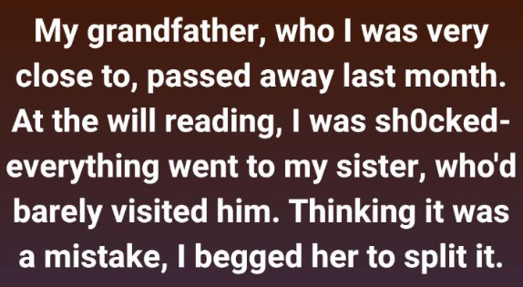 My grandfather, with whom I maintained an exceptionally close relationship, passed away during the preceding month. At the formal reading of his will, I experienced profound shock upon discovering he had bequeathed every single one of his assets to my sister—his vintage car, the entirety of his savings, and the deed to his comfortable, small house. She had spent minimal time with him, making his rationale utterly incomprehensible to me.